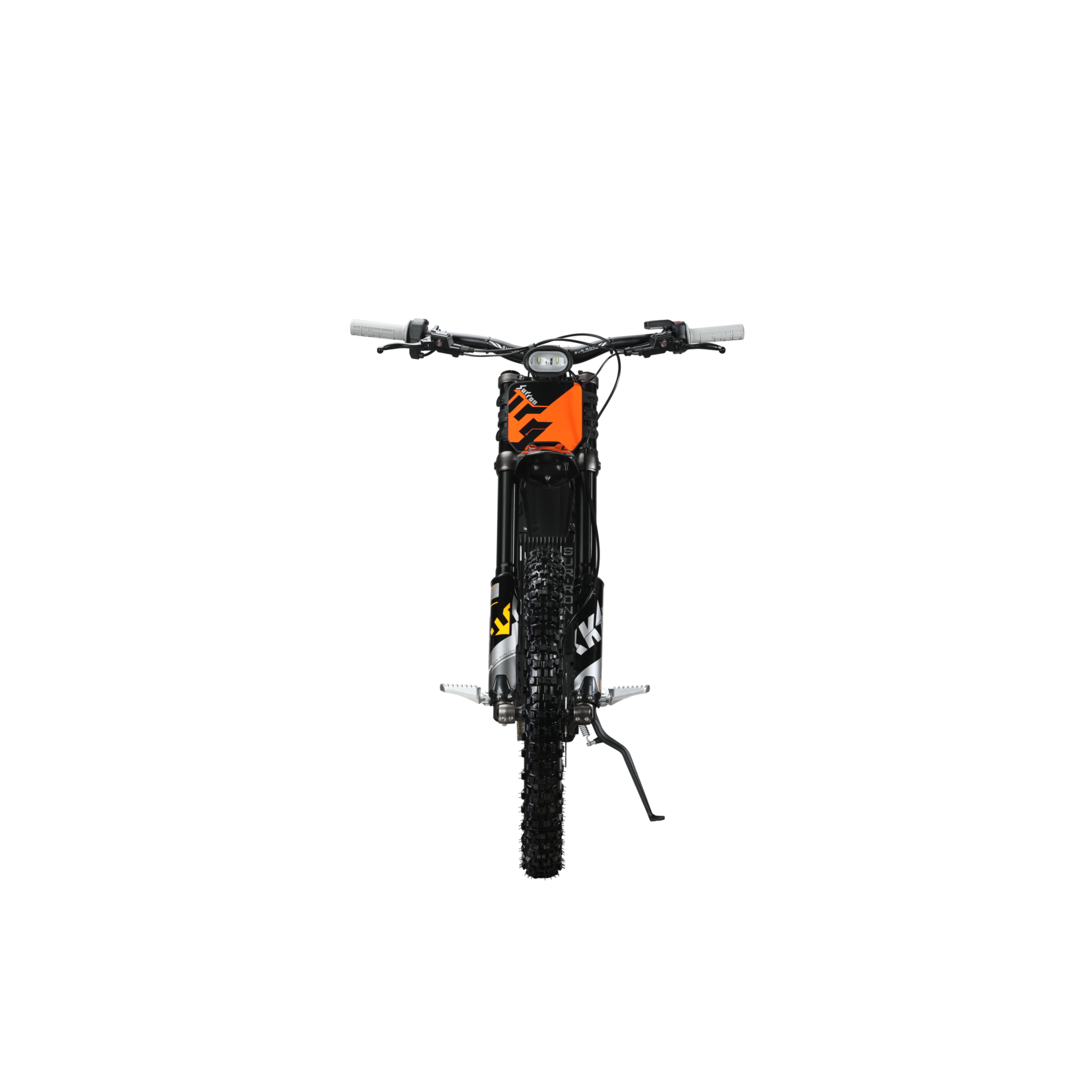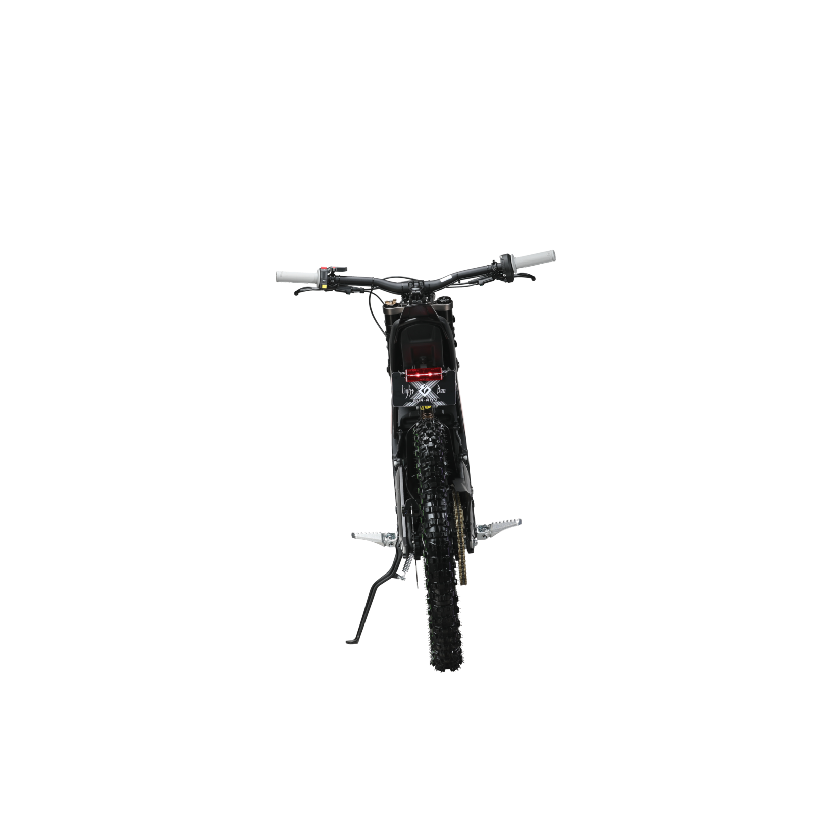 60V and over 6kW peak power from a replaceable Panasonic Lithium-ion battery pack. Forged lightweight alloy frame with high-end components, total weight of 47kg. Front and rear hydraulic disc brakes with four pistons. LCD dashboard with USB charging port. Aimed at adolescents and adults, with a climbing ability of over 45°, it provides hours of near-silent pleasure and a range of up to 90 km per charge, depending on mode. Top speed of 70 km/h or more, with a fast recharge time of 2.5 to 3.5 hours. The Light Bee X has some similarities with the E Ride Pro SS and Talaria MX5 Pro